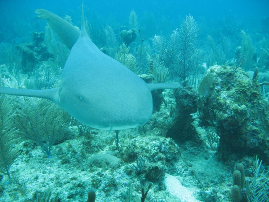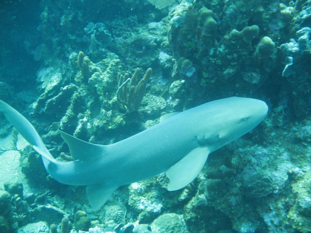 Am nächsten Tag steigen wir wieder vorfreudig aufs Boot und Hannah begrüßt erneut klatschend unseren Captain José. Alle lachen, als er leicht belustigt den Kopf schüttelt. Wie gesagt, definitiv der coolste Captain aller Zeiten. Da das Wasser für diese Jahreszeit doch erstaunlich kalt ist, sattle ich um von einem 3-mm Shorty auf einen 5-mm Langanzug. Eigentlich bin ich, was die Wassertemperatur angeht, relativ unempfindlich, aber dieses Mal geht es nicht anders und ich muss mich anpassen. Ich mag lange Anzüge schon deshalb nicht, weil sie ewig zum Trocknen brauchen und das Reinpellen ein nerviger Akt ist. Als ich den „Wetsuit-Dance“ schließlich erfolgreich beendet habe, freue ich mich auf den Tauchplatz, denn hier scheint es Chancen auf Haie zu geben. Also nichts wie rein! Es handelt sich wieder um eine Steilwand, die gleich zu Beginn mit einer Eigenart aufwartet. Aus mehreren Schwämmen brodelt es weiße Bröckchen heraus, als ob  ein Vulkan ausbricht. So etwas habe ich noch nie gesehen! Ein seltsames Schauspiel, was aber wiederum viele Fische anlockt. So kommt es, dass sich viele Kaiserfische zu uns gesellen und wie wild anfangen außerdem unsere Luftblasen zu fressen. Als wir weitertauchen genießen wir wieder die voll intakte Rifflandschaft und sehen Lobster, eine Muräne, einen Drachenkopf und obligatorisch viele bunte Fische. Nach ca. 40 Minuten treibe ich gerade etwas am Rand der Gruppe als Hannah nach vorne zeigt. Da kommt er, ein wirklich stattlicher Ammenhai von ca. 2 Meter Größe schwimmt schnell aber ganz ruhig auf uns zu. Meine GoPro habe ich glücklicherweise griffbereit und so kann ich schnell auf Aufnahme drücken. Der Ammenhai zieht im Halbkreis an uns vorbei und ist anscheinend von den ersten Verfolgungsversuchen etwas irritiert, weshalb er wieder ins Blaue verschwindet. Nur wenige Minuten später kommt er zurück, was aber kaum jemand mitbekommt, weil wir mittlerweile einen zweiten schlafenden Ammenhai in einer Felsspalte entdeckt haben. Dieser ist kleiner, liegt aber sehr dekorativ im Sand von einer schönen Riffkulisse umgeben, weshalb die Fotografen sich voll ins Zeug legen. Die zweite Runde des größeren Ammenhais ist wieder schnell vorbei, aber alle freuen sich mächtig. Zwei Haie so nah – super! Genau in diesem Moment dreht der große Ammenhai um und schwimmt direkt auf mich zu. Auf mich, nicht auf die Gruppe, voll auf mich, denn ich befinde mich quasi als Speerspitze leicht abseits. Die Kamera läuft und ich kann mein Glück kaum fassen. Er schwimmt schön unter mir hindurch, die rote Lampe an meiner Kamera leuchtet und ich denke schon jetzt daran wie super dieses Video wird. Sensationell. Direkt hinter mir macht er einen schnellen, kräftigen Bogen und hält sofort wieder unmittelbar auf mich zu, dieses Mal allerdings schon hüfthoch. Wahnsinn, es wird immer besser. Bloß nicht das Bild verwackeln. Hinter mir dreht der Ammenhai eine Schleife um einen bewachsenen Felsen herum, als der Rest der Gruppe seine Rückkehr feststellt und schnell in meine Richtung flosselt. Da dreht der Ammenhai ein zweites Mal um, kommt aus der Deckung des Felsen hervor und schwimmt mir direkt ins Gesicht. Bamm! Unfassbar. Auf dem Video sieht es wirklich schon beeindruckend aus, aber man erkennt trotzdem aufgrund des Weitwinkels nicht wirklich, dass wir uns fast geküsst hätten. Was für ein Volltreffer, was für ein Glück, was für ein Hammererlebnis! Eine Minute und sechzehn Sekunden dauert diese exklusive Begegnung und ich freue mich wie ein kleines Kind. Als der Hai weiter schwimmt, drücke ich mit einer Mischung aus aufgeregt und fasziniert auf die Stop-Taste der Kamera und kann nicht wirklich glauben, was gerade passiert ist. Den schönen, weil großen Fischschwarm und sogar einen dicken Nassau-Grouper beim Auftauchen nehme ich nur am Rande war, denn diese Hai-Nummer war tatsächlich ein Highlight meines Taucher-Lebens. Das Video können Sie sich übriges hier auf unsere Facebook-Seite ansehen – freuen Sie sich mit mir.