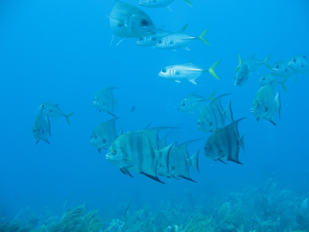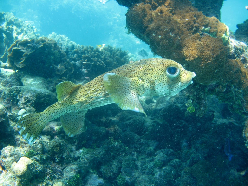 Der erste Tauchplatz führt uns an eine Steilwand, die richtig satt bewachsen ist. Ich hatte eingangs ja erwähnt, dass ich überrascht war, wie gut die Tauchplätze waren, was vor allem daran liegt, dass ich bisher nur Tauchplätze auf der einen Seite der Insel kennen gelernt habe. Wir sind beim Verkauf immer vorsichtig, weil man nach Útila eben auf keinen Fall NUR wegen des Tauchens reisen sollte, denn das würde der Insel nicht gerecht werden. Hannah ist klasse, sie sieht und zeigt unter Wasser sehr viel, was mir ausgesprochen recht ist. Einige aus unserer Gruppen ziehen es vor, alleine zu tauchen, was die Gruppen- und Buddyeinteilung deutlich erleichtert. Dabei haben wir mit Michaela auch wirklich ein „Trüffelschwein“ in unserer Runde, die immer wieder kleinste, getarnte und noch so gut versteckte Fische, Krabben oder Schnecken findet. Hut ab! Mit so einem Buddy, macht das Tauchen sicherlich nochmal deutlich mehr Spaß, als mit einem Blindfisch mit schlechtem Karma wie z.B. mir. Es gibt viel zu sehen und ich lerne viele neue Fischarten kennen, die ich zwar schon mal gesehen habe, von denen ich bisher aber keine Ahnung hatte wie sie heißen, also die bislang maximal Teil von VBF, viele bunte Fische, waren. Unser Taucher-Trüffelschwein (was natürlich uncharmant klingt, in Wirklichkeit aber als größtes Kompliment gemeint ist) Michaela kennt sie alle mit Namen und ist beim Logbuchschreiben hilfreicher als jeder Reef-Guide: Eberlippfisch zum Beispiel! Super Name, hatte ich vorher noch nie gehört! Wir sehen bei fast jedem tieferen Tauchgang Creolen Lippfische, einmal zieht ein riesiger Schwarm Stachelmakrelen vorbei, ich lerne Blaukopf-Junker kennen, die bei der Geburt geschlechtslos sind und dieses dann ihrem sozialen Umfeld anpassen, jede Menge Füsiliere begleiten uns und immer wieder flattern Schwärme von Doktorfischen an der Riffkante entlang.  Zurück an Bord verteilt Hannah Kekse, Wasser gibt es sowieso. Da morgens bei einer Ausfahrt immer zwei Tauchgänge durchgeführt werden, genieße ich die Pause auf dem Dach der Old Tom und lasse mich von der Sonne wärmen. Der Kontrast aus dem gelben Boot und dem türkisblauen Wasser ist dabei völlig unwirklich. Dazu gibt es karibische Reggae Musik aus Captain Josés Musiksammlung und sogar die, bei denen man es nicht vermutet hätte, wippen im Takt mit dem Kopf. Den zweiten Tauchgang absolvieren wir an einem flacheren Tauchplatz, wo der Schwerpunkt mehr auf den „etwas kleineren Sachen“ liegt. Kein Problem, im Gegenteil, die Sicht ist durch die Sonne fantastisch und die Farben kommen so noch mehr zur Geltung. Mein Buddy Thomas und ich starten locker in den Tauchgang, indem wir ein Feld Sandaale entdecken, direkt gefolgt von einer Roten Helmschnecke und schließlich einem Stachelrochen, der sich immer wieder in den Sand einbuddelt, um sich gleich wieder von dem körnigen Ballast zu befreien. Das schönste aber ist, dass der Rochen einen surfenden Beifahrer hat, denn ein kleiner Fisch legt sich immer wieder auf seinen Flügeln ab und reitet so quasi den Rochen. Ein fabelhaftes Bild! Danach geht es aber genauso spannend weiter, denn wir sehen Lobster, Gespensterkrabben, die sich immer wieder in dem bunten Korallenfeld verstecken, und einige Butte, die verwirrend mit ihren Augen rollen. Als unsere Luft fast schon aufgebraucht ist, folgen wir einem massigen Fischschwarm, der sich schnell und gekonnt durchs Riff schlängelt. Leider war Michaela nicht dabei, deshalb weiß ich nicht, was für eine Fischart das war, aber es sah klasse aus. Ich muss dazu sagen, ich liebe Fischschwärme! Das hatte ich in meinem letzten Newsletter schon erwähnt, aber das kann ich nicht oft genug sagen. Ich liebe es, die Bewegungen zu beobachten und mit welcher Geschwindigkeit hier synchrones Schwimmen umgesetzt wird. Auf jeden Fall folgen wir diesem Schwarm und stoßen dabei direkt auf eine gewaltige Geweihkoralle! Ganz ehrlich, ich weiß nicht, ob ich schon jemals ein solches Trum gesehen habe, aber der Stamm und die Äste waren mehr als dick und kräftig. Die Koralle selbst ist schon toll genug, aber um das Ganze noch zu toppen, versteckt sich in dem Geäst ein riesiger Igelfisch. Ich möchte hier wirklich nicht übertreiben, aber der Gute war enorm. Das helle Grau des Igelfisches, dazu das matte Rot der Geweihkorallen zusammen mit dem hellblauen Wasser war ein wunderschönes Bild und der perfekte Abschluss eines ereignisreichen Tauchgangs. Kaum, dass wir aufgetaucht sind, klatschen mein Buddy Thomas und ich uns euphorisch über Wasser ab. Was für ein Spaß!