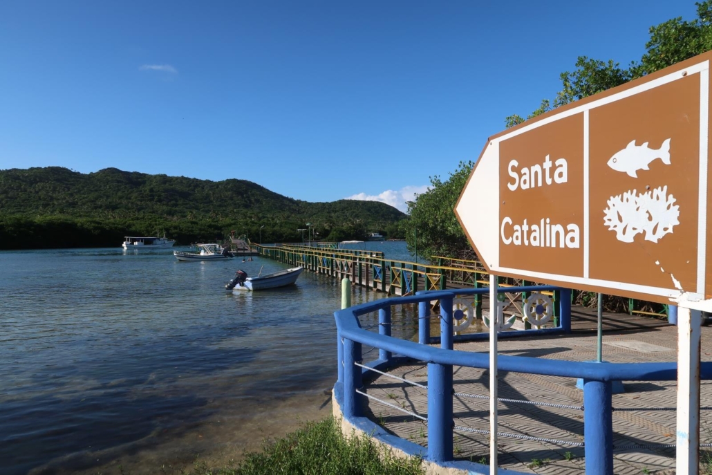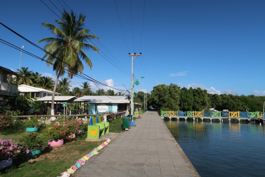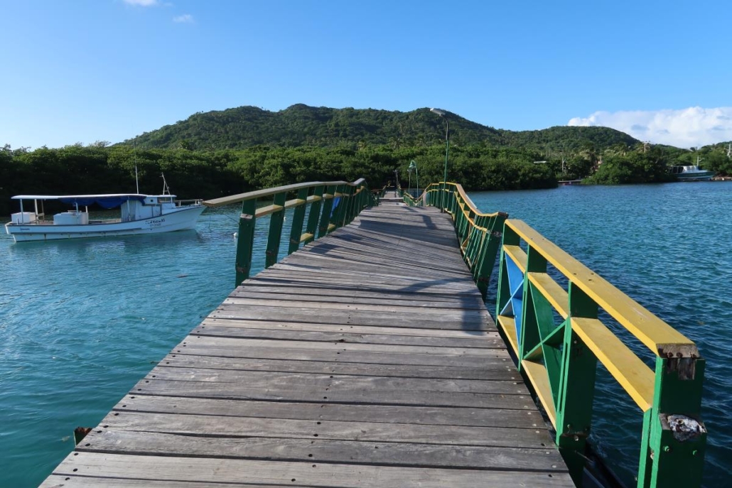 Vom Southwest Beach fährt man mit dem Moped ca. 20 Minuten ganz in den Norden, sprich es sind eigentlich immer kurze Wege. Selbst bei einer solchen Fahrt gibt es immer genug zu sehen und entsprechend rolle ich ganz gemütlich über die Straßen. Das Besondere an Santa Catalina ist, dass man die Insel nur zu Fuß über eine schauklige Brücke erreicht. Die Hauptstadt der Insel, wo auch die Fähre anlegt und die Verbindung zu Santa Catalina darstellt, heißt völlig unprätentiös „the Town“. Einfach zu merken und kreativ dazu, da gibt es mal nichts. Als ich vor der Brücke stehe, weicht das Live-Bild leicht von dem ab, welches ich davor schon einmal in einem Magazin gesehen habe, denn der Bretterweg übers Wasser verläuft fast schon spiralförmig, will sagen krumm und schief. Das sieht nach Spaß aus.