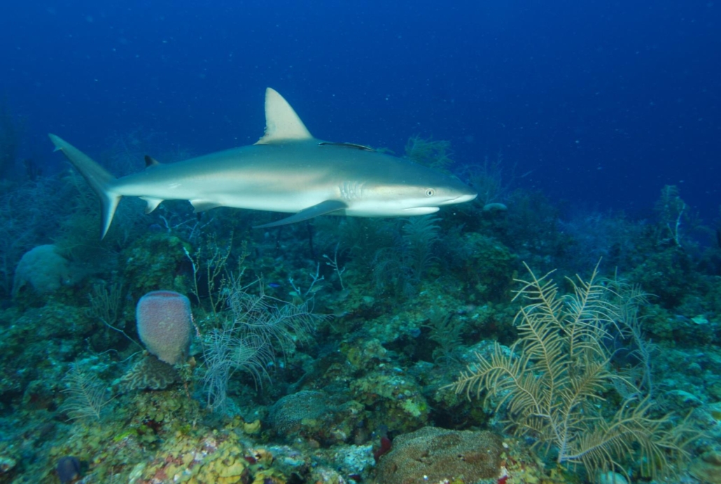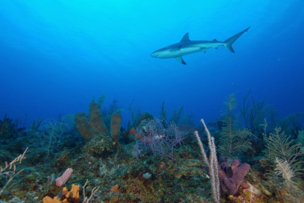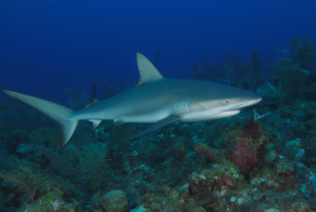 Am nächsten Morgen steht mein erster Tauchgang an und ich bin extrem aufgeregt. Eine schöne Insel ist das eine, aber die Tauchgebiete sind natürlich der entscheidende Faktor für mich. Die Empfehlung unserer langjährigen Agentur war die Tauchbasis Sirius und die Online-Berichte unterstreichen dies. Praktischerweise befindet sich die Station direkt am Southwest Beach, angegliedert an das gleichnamige Hotel. Von außen ist die Basis etwas unscheinbar, aber das ist hier auf der Insel überall so. Ich werde ausgesprochen motiviert von Guide Marcos begrüßt. Gleich gefolgt von Shampoo, dem Kapitän des Bootes. Shampoo ist sein Spitzname, warum habe ich leider nicht herausfinden können. Vielleicht weil er eine Glatze hat?! In jedem Fall ist der Name leicht zu merken. „Hello Mr. Jan“! Dazu bringt er mir direkt das High Five der Insel bei: Erst abklatschen, dann eine Faust und dabei die Hand nach rechts verdrehen. „Ya Man, Mr. Jan“. Diese Insellockerheit ist einfach klasse. Shampoo ist ein irre lieber Kerl, der immer für einen lockeren Plausch zu haben ist. Die Amerikaner würden sagen „a people’s person“, jemanden den man irgendwie schnell gern mag. Das Briefing von Marcos ist recht knapp, denn seine einzige Aussage ist, dass man an dem Tauchplatz immer viele Haie sehen kann. Danach korrigiert er sich direkt und meint, dass man eigentlich überall viele Haie sehen kann. Das Grinsen danach spricht Bände. Sehr gut, es kann losgehen. Das Riff liegt auf ca. 15 Metern, das heißt Abtauchen im Blauwasser. Ein dicker Schwarm Barben verdeckt mir kurz die Sicht, aber ich kann schnell erkennen, dass es sich um einen dicht bewachsenen Korallengarten handelt. Hart- und Weichkorallen in allen Varianten. Dazwischen viele bunte Fische. Es dauert handgestoppte 2 ½ Minuten als der erste Riffhai auftaucht und ein wenig neugierig seine Kreise um uns zieht. Nach ein paar Minuten haut er wieder ab und ich versuche mich wieder auf das Riffleben zu konzentrieren, was nur bedingt gelingt, denn es folgen direkt zwei weitere Haie. Größere Exemplare. Zwei, drei Meter. Marcos dreht sich um und zuckt mit den Schultern, nach dem Motto „Ich habe es dir ja gesagt“. Im Laufe des Tauchgangs kommen und gehen immer wieder Haie, zu einem Zeitpunkt habe ich zwischenzeitlich einmal sieben Stück gezählt. Meine GoPro-Kamera bekommt keine Pausen (hier können Sie ein schönes Video von dem Tauchgang sehen). Was für ein Knaller-Auftakt! Wieder an Bord erzählen mir Shampoo und Marcos, dass vor einigen Jahren, als das ganze Dilemma mit den Rotfeuerfischen in der Karibik losging, die Guides ab und zu die Rotfeuerfische geschossen haben, um den Haien ihre neue Nahrung beizubringen. Seit über vier Jahren machen sie das aber nicht mehr. Marcos sagt, sie haben hier so viele Haie, dass sie eigentlich immer welche sehen, auch wenn es schon lange keine Leckerchen mehr für sie gibt. Der zweite Tauchgang bietet ein ähnliches Bild, wobei hier der Korallengarten noch schöner und voller Leben ist. Wie zuvor werden wir quasi immer wieder bis durchgängig von Haien begleitet, so dass ich mich fast schon zwingen muss von den Haien mal abzulassen, um auch die anderen Schönheiten des Riffs zu würdigen. Marcos geht es anscheinend genauso, denn einmal rumpelt er fast in eine freischwimmende, dicke Muräne hinein und ist sichtlich erschrocken, als sie kurz vor ihm herumzuckt. Es ist immer ein gutes Zeichen, wenn die Fische keine Scheu haben, sondern sich schon fast interessiert vor meiner Kamera zeigen. Ich komme aus dem Staunen nicht heraus. Den Abschluss des Tauchgangs bildet eine seelenruhig grasende Schildkröte, die an meiner Anwesenheit scheinbar gar nichts auszusetzen hat. Irgendwann schwimmt sie dann doch weiter, aber auch das karibisch entspannt. Zwei Spitzentauchgänge, die mir viel Euphorie geben.
