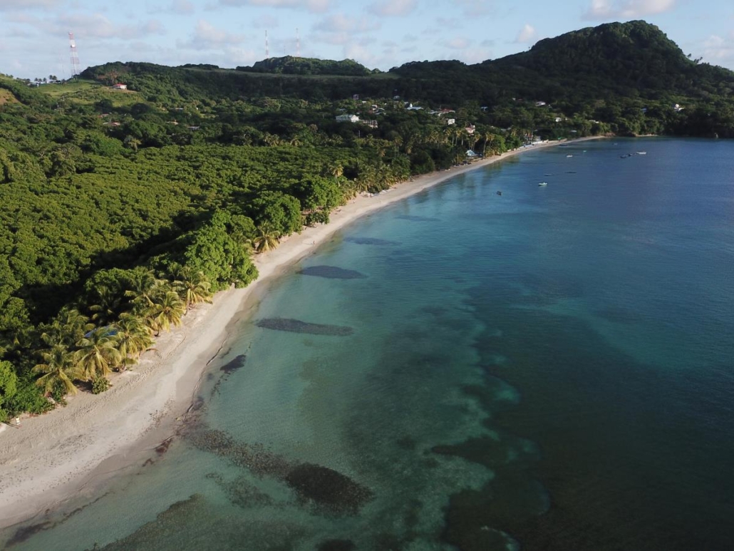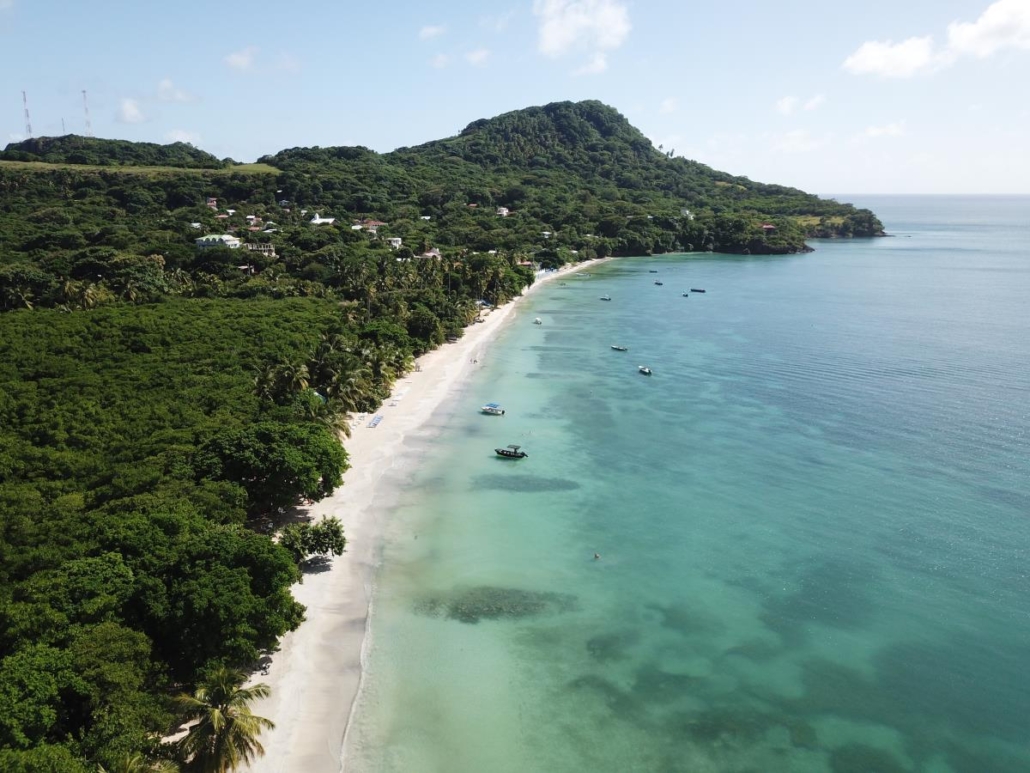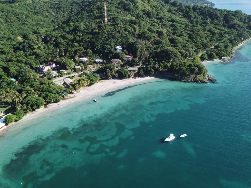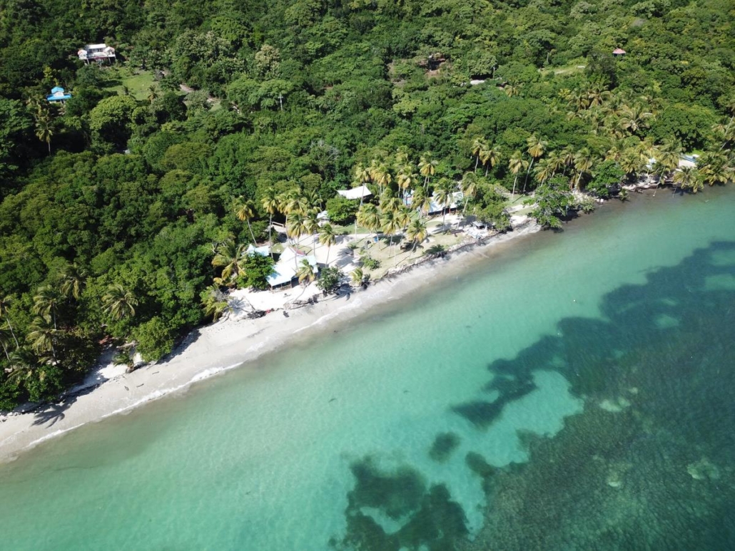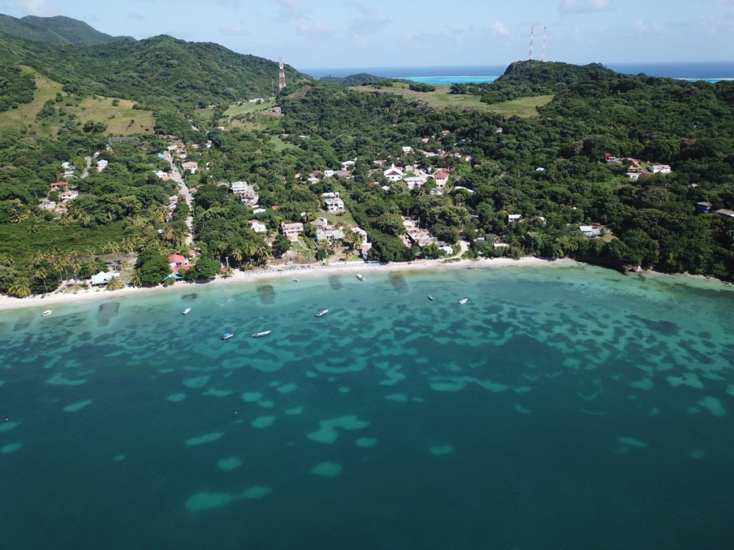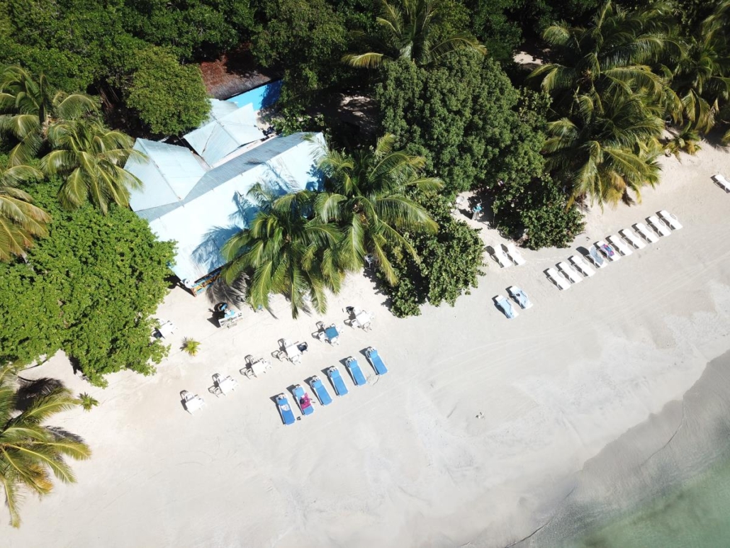 Zeit mein neues Spielzeug auszuprobieren, welches mir in Belize noch so schmerzhaft bei der Einreise abgeknüpft wurde -meine Drohne! Ein besseres Motiv als hier am Southwest Beach wird es wohl kaum mehr geben. Ich gehe ein bisschen den Strand entlang, um idealerweise die Mitte zu erreichen und entdecke in dem Palmenwald kleine bunte Hütten bei denen es sich um Bars oder Restaurants handelt. Nicht klassisch schön, sondern karibisch eben: praktisch zusammengezimmerte Bretterbuden. Ich liebe es. Während ich so auf dem Übergang zwischen Meer und Strand in den auslaufenden Wellen spaziere, bemerke ich in meiner Euphorie kaum, wie groß der Strand ist. Es handelt sich quasi um zwei aneinandergrenzende, sichelmondförmige Buchten, die man aber nur an der Berührungsstelle komplett in beide Richtungen überblicken kann. Ich wüsste nicht, wie es noch schöner sein könnte und lasse voller Euphorie meine Drohne am Schnittpunkt steigen. Der Southwest Beach ist sicherlich einer der schönsten Strände, den ich je in der Karibik, wenn nicht sogar überhaupt jemals, gesehen habe. So einen Superlativ muss ich jetzt einfach mal verwenden, denn hier passt einfach alles. Warum er auf den alljährlichen Top-Listen nicht auftaucht, kann ich mir nur damit erklären, dass der Strand zu „echt“ ist. Hier liegt schon mal eine Kokosnuss am Boden oder ein angeschwemmtes Stück Holz bleibt liegen, aber ich denke meine Drohnenbilder sprechen für sich.