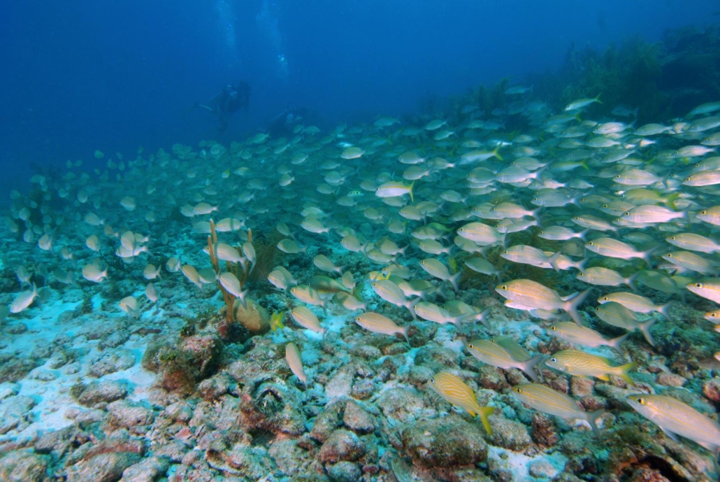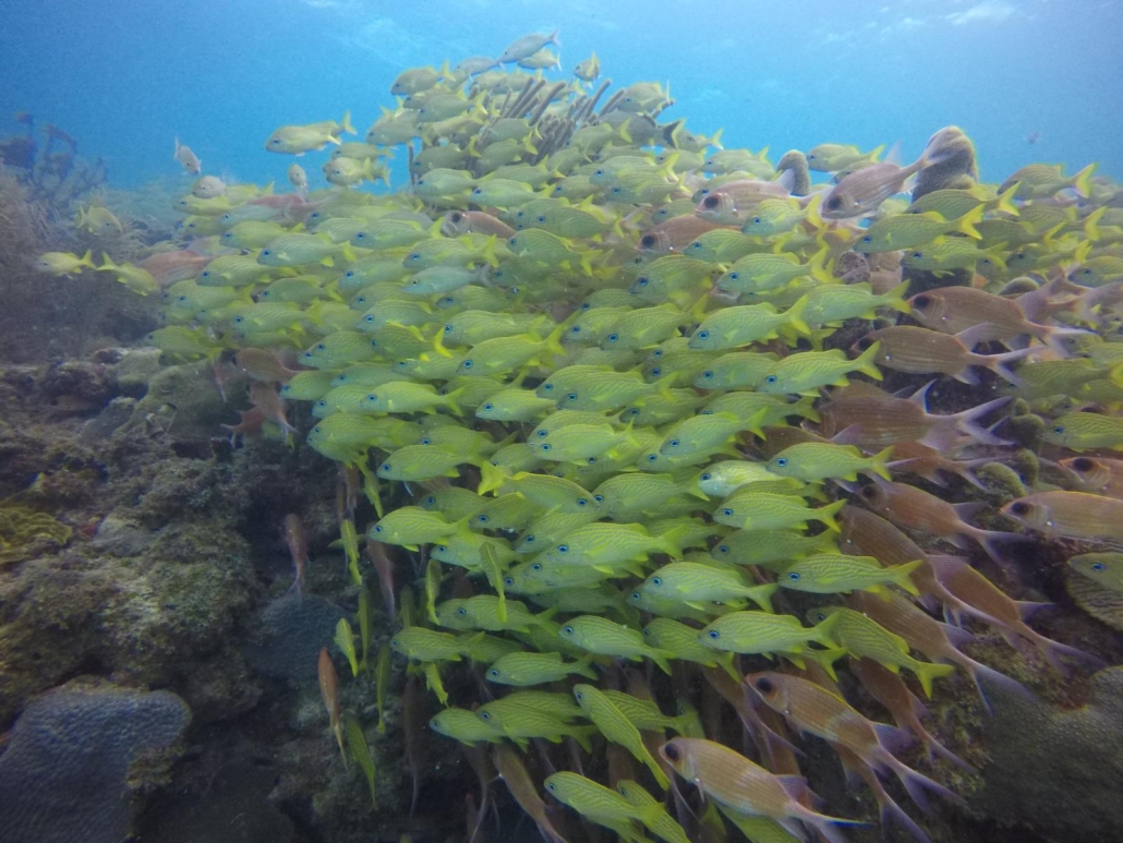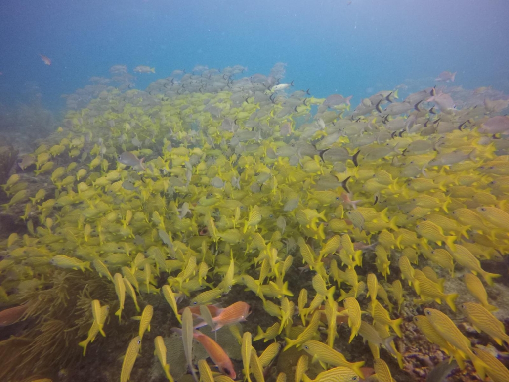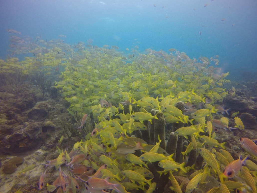 Zurück zum Tauchen. Ich hatte hier irgendwie den ganzen Aufenthalt über ein besonderes Gefühl, was das Tauchen angeht, denn ich hatte den Eindruck, ich kann hier noch etwas entdecken. Man taucht ja überall alleine, schließlich gibt es nur drei kleine Tauchbasen auf Providencia. Und das pralle Unterwasserleben zieht einen definitiv in seinen aufregenden Bann. Ich wollte immer mehr sehen! Ich war jeden Tag neugierig, was Providencia heute zu bieten hat. Und irgendwie war ich auch gespannt, ob ich tatsächlich bei jedem Tauchgang Haie sehen werde – wobei ich das Ergebnis ja bereits vorweggenommen habe. Ich habe in der Tat bei jedem Tauchgang mindestens einen Hai gesehen. Der Morgen-Tauchgang war wieder klasse, „Felipe’s Place“ bietet eine wuchtige Steilwand, eine Jesus-Statue, Spalten und Canyons zum hindurchtauchen und eben Haie. Bei der Oberflächenpause reicht mir Daniel eine Packung Kekse und fragt mich fast entschuldigend, „ob es ok wäre, mal einen flachen Tauchgang zu machen. Ich würde es bestimmt nicht bereuen“. Felipe’s Place war gerade wieder etwas tiefer, denn die Steilwand hatte einen Überhang zu bieten, den ich mir nicht entgehen lassen wollte. Nun bin ich nicht wirklich ein Tiefenjäger, aber einige Tauchplätze bieten hier einfach einen gewissen Reiz. Trotzdem, natürlich war ich sofort einverstanden, denn Daniels Grinsen bei der Frage war unmissverständlich und vielsagend. Er hatte etwas Besonderes vor. Als wir beim Tauchplatz „Tete’s Place“ ankommen, schimmert das Wasser hellblau und ich kann den Sandboden auch entsprechend schnell erkennen. Mal sehen, was da kommt!? Beim Briefing muss er zwei bis dreimal lachend abbrechen, weshalb ich ihm nahelege, dass wir uns einfach überraschen lassen. Mein amerikanischer Buddy und ich sind beide aufgeregt und vorfreudig. Also rein ins Wasser. Auf ca. acht Metern angekommen, finden wir eine weite Sandfläche und ein Rochen zappelt sich aus seinem Sandversteck. Wir schwimmen auf eine flache Riffbank zu und ich kann noch nicht direkt etwas Außergewöhnliches erkennen. Ich albere mich also durch ein paar Videoaufnahmen mit einem weiteren Rochen und schließlich einem Ammenhai, als sich Daniel bemerkbar macht und sich anschließend wie ein Zirkusdirektor mit einer präsentierenden Handbewegung vor mir verbeugt. Und dann sehe ich was er meint. Wow! Ich glaube so etwas habe ich tatsächlich überhaupt noch nie gesehen! Da wo eigentlich das Riff sein sollte, sehe ich nur Fische! Besser gesagt eine Wand aus Fischen. Eine dicke, fette Fischwolke. Schnapper so weit das Auge reicht. Es ist unbeschreiblich. Sie bewegen sich kaum, sondern stehen einfach in einer beeindruckenden Formation über dem Sandboden. Erst als ich mich immer noch ein bisschen ungläubig auf sie zu bewege, verschiebt sich ganz langsam dieser unfassbare Block an Leben. Die Sache ist nur die, je weniger Schnapper ich sehe, desto mehr Grunzer werden es. Und nach den Grunzern kommen direkt Soldatenfische. Überall Fische. Es dauert ein bisschen, aber irgendwann kann ich das Riff schließlich wieder sehen und es ist für mich einfach die pure Freude dieses Fischgewitter über der Korallenlandschaft schweben zu sehen. Die zahlreichen Muränen zwischen den Korallen werden ganz klar zu Nebendarstellern deklassiert, weil es hier für einen Fischschwarmfan wie mich das absolute Paradies ist. Plötzlich rührt sich was. Zuerst bin ich mir nicht ganz sicher, aber dann geht es schnell. Die Schwärme teilen sich hastig und wie aus dem Nichts tut sich blitzartig eine Gasse auf. Ein Tuna jagt mit einem irren Tempo durch die Massen. Es ist ein Spektakel. Der ganze Tauchgang besteht letztlich nur aus Fischschwärmen. Gefühlt filme ich dreißig Mal das gleiche, aber ich kann nicht widerstehen (hier finden Sie wieder ein Video zu dem Tauchgang). Zu faszinierend ist diese unfassbare Menge an Fisch. Das Austauchen ist ein letzter Blick von oben herab auf diese außergewöhnliche Szenerie. Wieder an Bord, grinst Daniel: „You liked it, ha man?“ – „Yes, I did“. Ja, das habe ich. Sehr sogar. Fischschwärme wie diese habe ich bisher nur auf Little Corn Island in Nicaragua gesehen, aber nicht in der Masse. Das war etwas anderes hier. Absolut fantastisch. Providencia gewinnt immer mehr mein Herz.