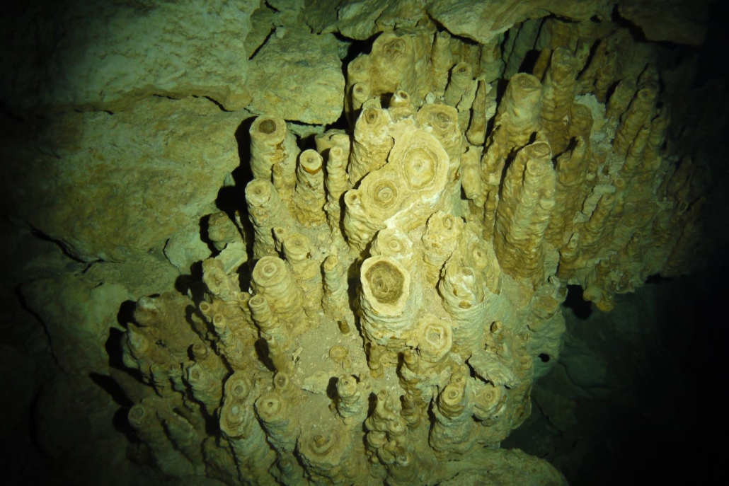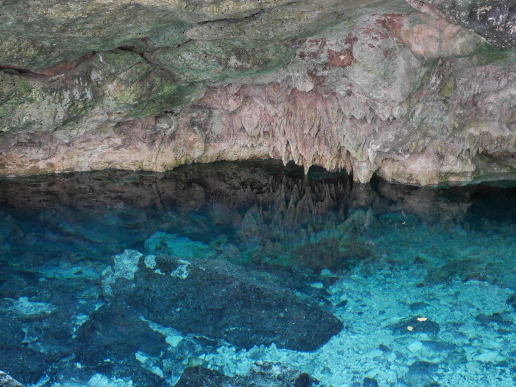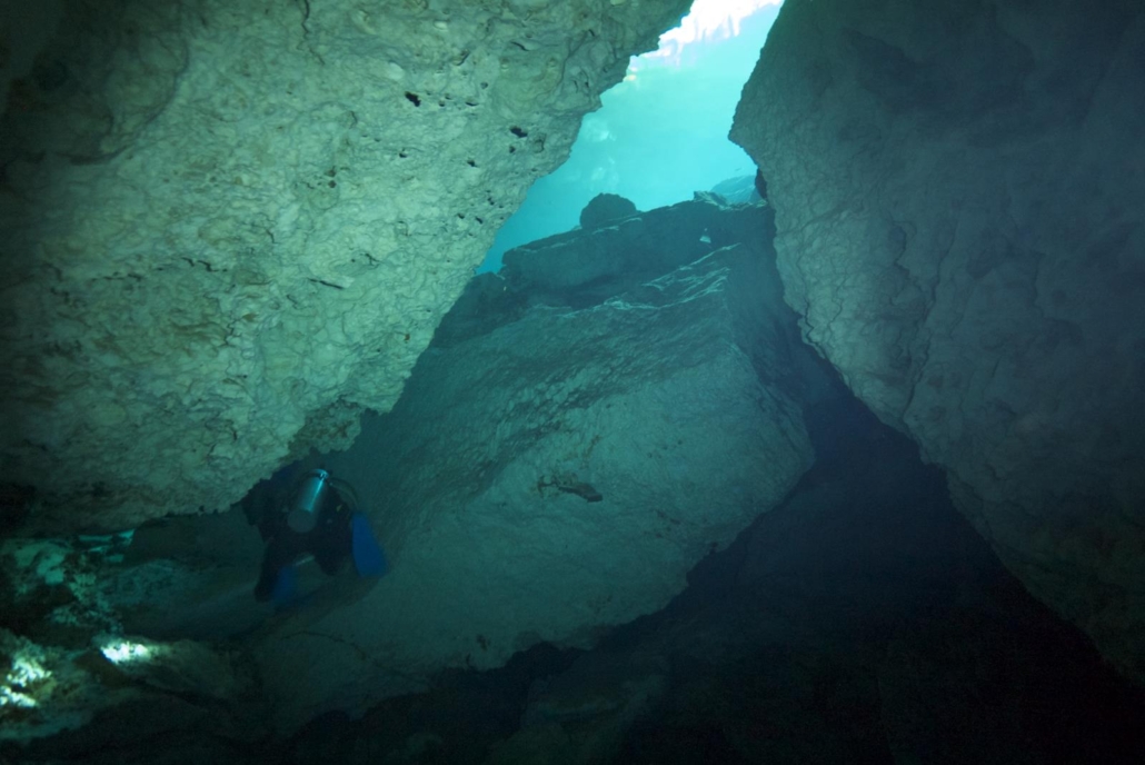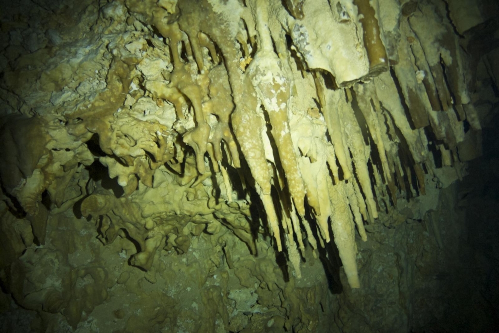 Nach diesem sensationellen Erlebnis – das Wort Sensation möchte ich hier wirklich als eine Art Außenseitersieg verstanden wissen, denn dass ich so viele Walhaie auf einmal sehe, ist der Sieg eines Amateurs gegen einen Bundesligisten – kann das darauffolgende normalerweise ja nur verlieren. Aber, genau aus diesem Grund habe ich mir als Anschluss etwas ausgesucht, das mit der Walhaitour quasi gar nichts gemeinsam hat: Höhlentauchen! In Mexiko, und speziell hier in Yucatán, gibt es nämlich Süßwasserhöhlen, so genannte Cenoten. Korrekterweise ist die Mehrzahl von Cenote Cenotes, denn das Wort ist spanisch, aber die meisten Deutschen sagen doch Cenoten, dies nur der Korrektheit halber am Rande. Cenoten, was ist das überhaupt? Viele Taucher werden das irgendwie schon mal gelesen oder gehört haben, aber was dahinter steckt, ist etwas Außergewöhnliches. Und zwar entstanden die Cenoten dort, wo, ganz generell gesprochen, das Kalkgestein durch wechselnde Wasserstände (speziell nach den Eiszeiten) ausgehöhlt wurde. Das auf das Land wirkende Wasser (nach einer Eiszeit, senkt sich der Meeresspiegel langsam wieder ab) sucht sich seinen Weg zurück ins Meer und untergräbt so das Kalkgestein. Wenn dann die Decken einbrechen, entstehen Öffnungen und genau diese bezeichnet man dann als Cenoten. Der „Witz“ dabei ist: dieses ausgewaschene Höhlensystem ist mit Süßwasser gefüllt, was natürlich eine absolute Besonderheit ist. Für die in Yucatán lebenden Mayas waren die Cenoten vor allem große Brunnen, aber weil sie diese Öffnungen als Eingang zur Unterwelt sahen, dienten einige Cenoten auch als Opferstätte! Dies waren allerdings Cenoten, die sich in unmittelbarer Nähe zu den großen Städten und Tempelanlagen, befanden, während die Cenoten, die jetzt betaucht werden, in Meeresnähe liegen. Dort ist das Höhlensystem nämlich viel ausgeprägter und interessanter, die „Gänge“ sind größer und es gibt deutlich mehr Durchbrüche, also Bereiche in denen Tageslicht die Höhlen erfüllt. Taucherisch haben die Cenoten nun gar nichts zu tun mit dem Freiwasser-Schnorchel-Erlebnis mit den Walhaien: offenes Meer gegen Höhle, Salz- gegen Süßwasser, Fische gegen Stalaktiten…