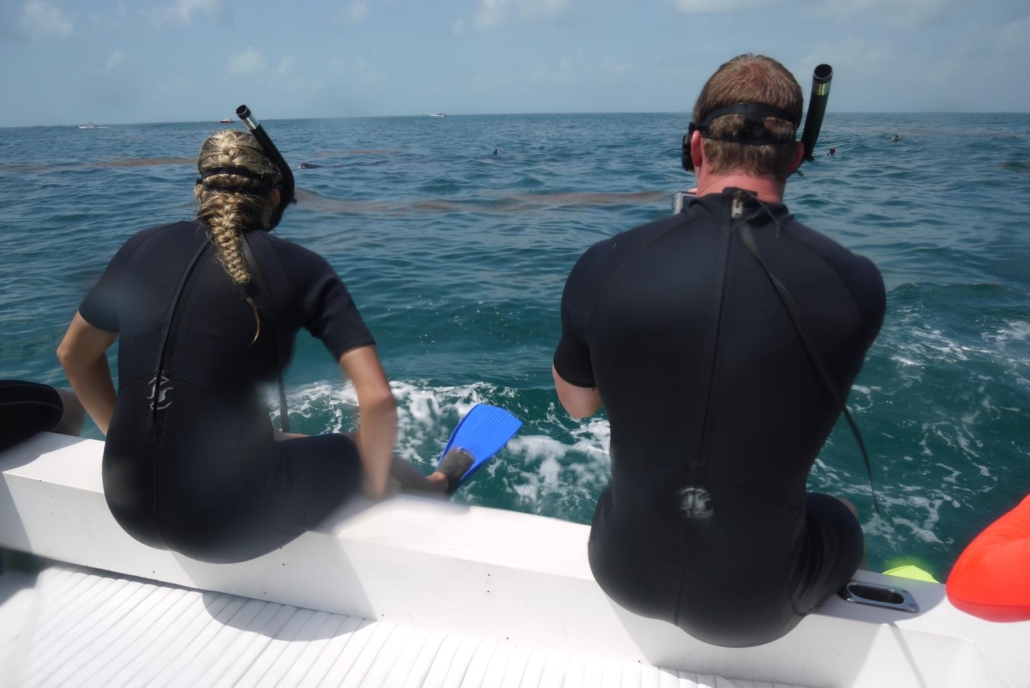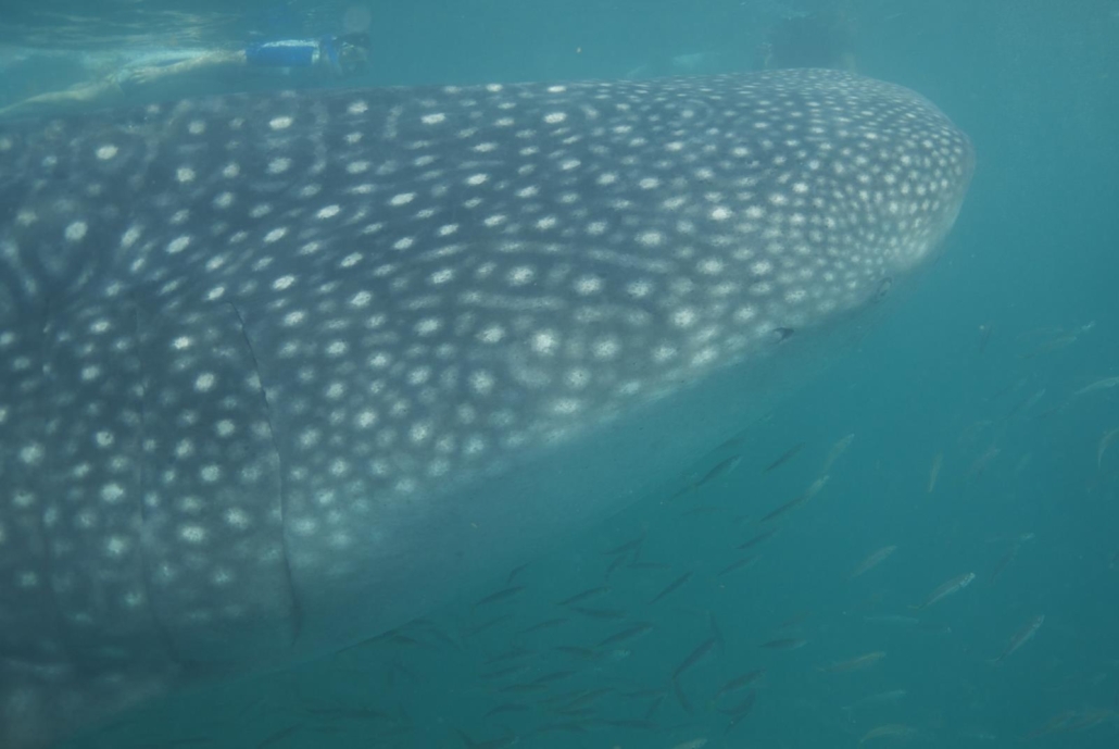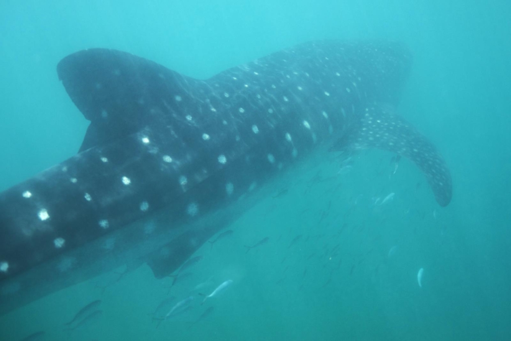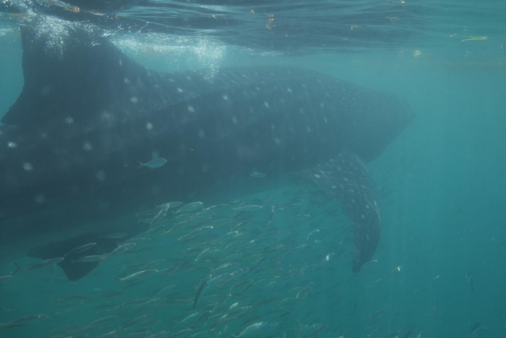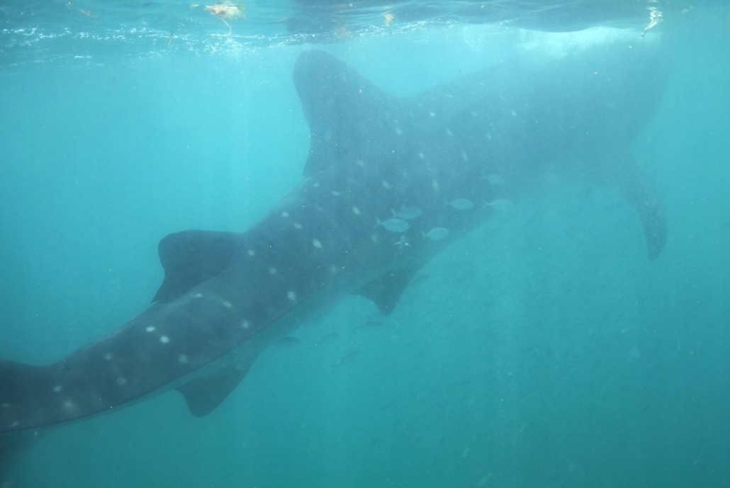 An der Stelle möchte ich darauf hinweisen, dass diese Walhaitouren natürlich touristisch sind, aber dass die Ausflüge in Zusammenarbeit mit der mexikanischen Umwelt- und Nationalparkbehörde durchgeführt werden. Sprich es gibt strenge Regeln, die von den Guides auch genau kontrolliert und eingehalten werden. Wer beispielsweise einen Walhai anfasst, darf nicht mehr ins Wasser, ganz klar und ohne Ausnahme! Diese Bedingungen beinhalten aber auch, dass jeweils nur zwei Schnorchler plus Guide zu einem Walhai dürfen, die Tiere nicht gefüttert werden und ihnen auch nie der Weg abgeschnitten werden darf. Dies wäre zum Beispiel beim Tauchen der Fall, weshalb dies nicht erlaubt ist, sprich die Walhaie sollen immer die Möglichkeit haben, abzutauchen und sich damit von den Schnorchlern zu distanzieren. Ein Teil der Erlöse dieser Touren fließt auch in die wissenschaftliche Walhai-Forschung und vom Regierungsprojekt Domino werden wissenschaftliche Daten zur Verfügung gestellt. Es wird also seitens der Veranstalter vor Ort alles dafür getan, dass die Gäste die Walhaie auf ökologisch verantwortungsvolle Weise erleben dürfen. Ich selber habe dies auch genauso empfunden.