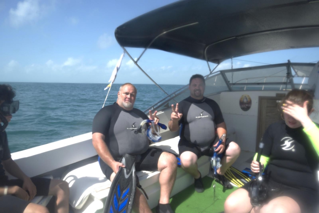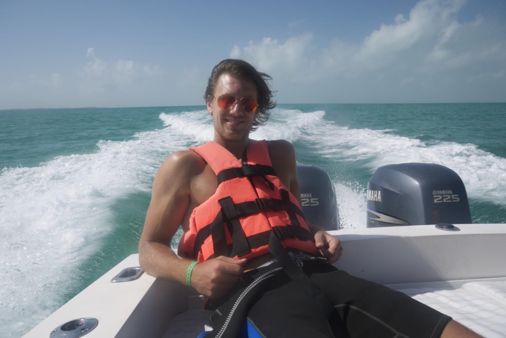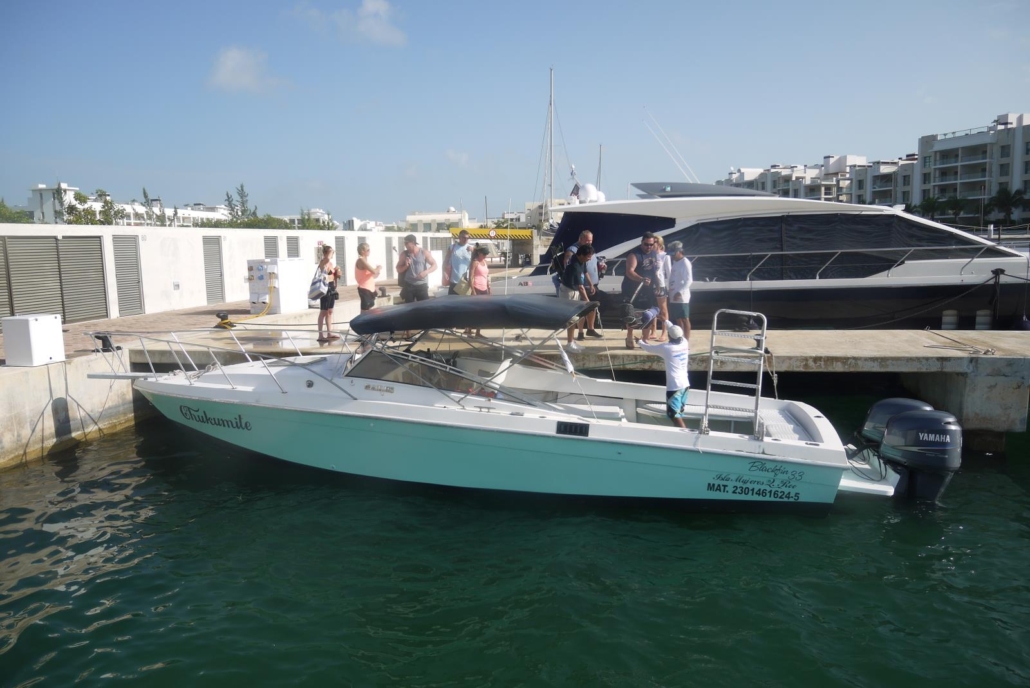 Als wir im privaten Hafenbereich von Playa del Carmen ankommen, brennt die Sonne. Mit „brennen“ meine ich, dass der Boden barfuß nicht zu betreten ist. Aber kein Problem, denn bald sind wir ja im Wasser und man merkt förmlich wie die freudige Aufregung jeden einzelnen einholt. Die Atmosphäre fühlt sich nach Urlaub an und jeder weiß, dass jetzt das Highlight ansteht. So wie früher als Kind, wenn die Eltern einem mitteilen, dass es gleich zum Aqua-Park mit vielen Rutschen geht. Ich liebe dieses Gefühl! So ein Highlight gibt es bei jeder Reise und mein Highlight für Mexiko steht unmittelbar bevor. Es gibt noch ein kleines Frühstück, bestehend aus Kuchen, Früchten, sowie Kaffee oder Tee. Getränke sind bei dem Ausflug auch mit inbegriffen, was angenehm ist, denn so gibt es eine große Kühlbox aus der sich jeder bedienen kann. Noch einmal kurz auf Toilette und wir klettern alle auf unser Speedboot. Der Captain, Cynthia und ein weiterer Guide erwarten uns schon und Cynthia teilt uns gleich in fünf 2er-Gruppen ein. In genau dieser Reihenfolge werden wir dann später auch ins Wasser zu den Walhaien springen – ich bin in Gruppe 2. Das Boot schippert aus dem Hafen hinaus und gibt danach sofort Vollgas, so dass wir förmlich übers Wasser fliegen. Der Fahrtwind, das spiegelnde Wasser, die strahlend gelbe Sonne im babyblauen Himmel, das Motorengeräusch und lauter strahlende Gäste – großartig. Wir passieren die Insel Contoy und die Hälse der Guides und des Captains werden länger. Plötzlich stoppen wir und die Crew ist sich einig, hier ist ein Walhai. Ich kann zwar nichts sehen, aber ich bin ja auch nicht in Gruppe 1. Das erste Pärchen macht sich also bereit und setzt sich, wie vorher im Briefing erklärt, sprungbereit an den Bootsrand. Cynthia sagt nochmal, dass wir wirklich Vollgas geben müssen, um dem Walhai zu folgen, denn die Viecher sind schnell. In dem Moment zeigt sich auch tatsächlich eine Flosse und der Captain gibt das Kommando: „Now!“ Keiner springt. Keine Ahnung wieso, aber nichts tut sich. Der Captain ruft nochmal „Jump!“ und das funktioniert. Pärchen eins drückt sich vom Boot ab und paddelt was das Zeug hält, um der Flosse hinterherzukommen. Als nächstes bin ich dran. Gruppe 1 ist mit Cynthia im Wasser und ich mache mich mit dem anderen Guide fertig. Wir warten bis Gruppe 1 zurück ans Boot kommt und als ich gerade noch höre, dass der Walhai zu schnell war, brüllt der Captain wieder „Now!“. Ich bin mir nicht sicher, jetzt? „Jump!“ kommt gleich hinterher gerufen und zack bin ich im Wasser. Ich schaue nach unten und kann sofort im trüben blaugrün die Umrisse des Walhais erkennen. Leider zu tief, wir brechen ab und planschen zurück zum Boot. Leichte Skepsis und Enttäuschung, vor allem bei Gruppe 3, denn der Captain erklärt, dass er weiterfahren wird. Anscheinend hatte der Walhai keine Lust auf Gesellschaft, weshalb er abgetaucht ist. Der Captain sagt, das sei das einfache Signal des Walhais, dass er gerade mehr Wert auf Ruhe als aufs Essen legt.