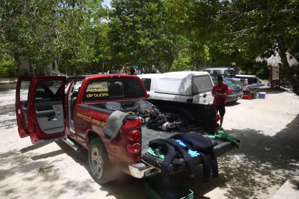 Bei der Tauchbasis Pro Dive gibt es einen absoluten Spezialisten für die Cenoten, jemanden der die Höhlen extrem gut kennt, und die vielleicht notwendige Ruhe für dieses Abenteuer besitzt und diese auch ausstrahlt: Cris. Er ist Spanier, hat aber lange in Deutschland gelebt und spricht deshalb sehr gut Deutsch. Seinen Full Cave-Tauchschein hat er hier in Mexiko gemacht, also genau dort, wo er auch tätig ist – beste Voraussetzungen wie ich finde. Und er sammelt zusätzlich Pluspunkte bei mir, weil er seinen Tauchlehrerkurs vorher auf der kleinen honduranischen Insel Utila absolviert hat – einer meiner Lieblingsflecken weltweit. Als wir uns in den Pick-Up schmeißen, um zu den Cenoten aufzubrechen, frage ich ihn vorsichtig, ob wir die Klimaanlage ausschalten können und er muss lachen. „Klar sehr gerne“ meint er, „davon wird man sowieso nur krank“. Er erzählt, dass als er in Mexiko ankam, er wegen der vielen Klimaanlagen die ersten sechs Monate nur erkältet war, mittlerweile habe sich der Körper aber an die künstliche Kälte gewöhnt. Wir fahren die schnurgerade Straße von Playa del Carmen südlich in Richtung Tulum und erreichen in nur 20 Minuten unsere Cenote. Meist sind an der Straße diverse Schilder, die auf die jeweilige Cenote hinweisen und man kann schnell erkennen, welche ausschließlich von Tauchern besucht werden und welche auch Tagestouristen empfangen. Einige der Schilder sind klein und sachlich, manche sind aber groß, aufwendig gestaltet und mit plakativen Bildern der Cenoten versehen. Teilweise kann man nämlich in den Cenoten auch schnorcheln, und zwar einfach dann, wenn der offene Einstiegsbereich Schwimmbad-ähnlich groß und nicht zu tief ist, so dass sich das Schnorcheln lohnt. Jede Cenote „gehört“ übrigens einer Familie, weshalb man bei der Einfahrt Eintritt bezahlen muss, um diese Gegend zu „nutzen“. Der Vorteil ist, dass diese Familien sich auch um die Cenoten und den kompletten Bereich drum herum kümmern, ihn intakt halten und pflegen. Nachdem die Seilsperre, die mittels einer schlauen Konstruktion bis zum Kassenhäuschen reicht, damit der Kassierer nicht aufstehen muss, zu Boden geht, können wir passieren. Es folgt ein langer Schotterweg mitten durch dichtes Gebüsch. Feuchtwarme Luft wabert durch die offenen Fenster ins Auto und mit ihr gefühlt tausend Mücken. „Daher die Klimaanlage“ schmunzelt Cris spaßig besserwisserisch. Als wir schließlich beim Parkplatz vor der Cenote ankommen, bin ich überrascht wie angenehm sauber das Gelände ist. Dank der Inhaber-Familien liegt hier kein Dreck herum, es gibt Abfalleimer, Tische die als Ablageflächen für das Tauchequipment dienen und auch Toiletten. Als nächstes rieche ich etwas Verbranntes und suche hastig nach der Quelle. In einem Eimer brennt irgendetwas und dicke, graue Rauchwolken steigen auf. „Gegen die Moskitos“ meint Cris. Ich schaue ungläubig, aber es wirkt. Erfreulicherweise sind wir die ersten an der Cenote, sprich wir können ganz vorne parken und haben dadurch die Pole-Position. Cris holt Getränke und Obst heraus und fängt an, mir ein ausführliches Briefing über die Verhaltensregeln in der Cenote zu geben. Sachlich, verständlich und absolut logisch dauert diese Einweisung eine halbe Stunde. Trotzdem, so viel Zeit muss sein, denn natürlich erfordert solch ein Höhlentauchgang andere Informationen, als ein Freiwassertauchgang. Die Cenoten sind auch schon für Open-Water-Taucher zugänglich, also müssen die Informationen sehr klar übermittelt werden, so dass sie jeder versteht. Sollte jemand Bedenken haben, hier ein paar Anmerkungen: Durch das gesamte Höhlensystem sind Schnüre gespannt worden, so dass man sich immer orientieren kann und dadurch auch sicher fühlt. Pro Gruppe gibt es maximal vier Taucher, jeder bekommt eine Lampe. Die Tiefe beträgt zwischen 1 und maximal 15 Metern, so kommt es öfters zu eben jenen, oben erwähnten Durchbrüchen, bei denen Licht in die Höhlen strömt. Für mich hört sich das alles gut und sicher an, weshalb ich mich bedenkenlos auf den Tauchgang freue. Ich habe bereits in den Cenoten getaucht, trotzdem ist es tatsächlich wieder etwas Besonderes und das merke ich auch, denn ich will ins Wasser! Vorher muss ich mich aber erst mal in den 7 mm dicken Tauchanzug hineinzwängen, was quälend lange dauert und furchtbar heiß ist. Wir sind zwar im Schatten, aber das Neopren wirkt wie eine Sauna. Eine Ein-Mann-Sauna, in der ich sitze und motiviert den Aufgusslöffel schwinge.