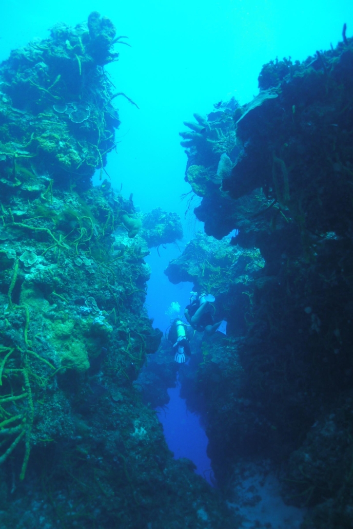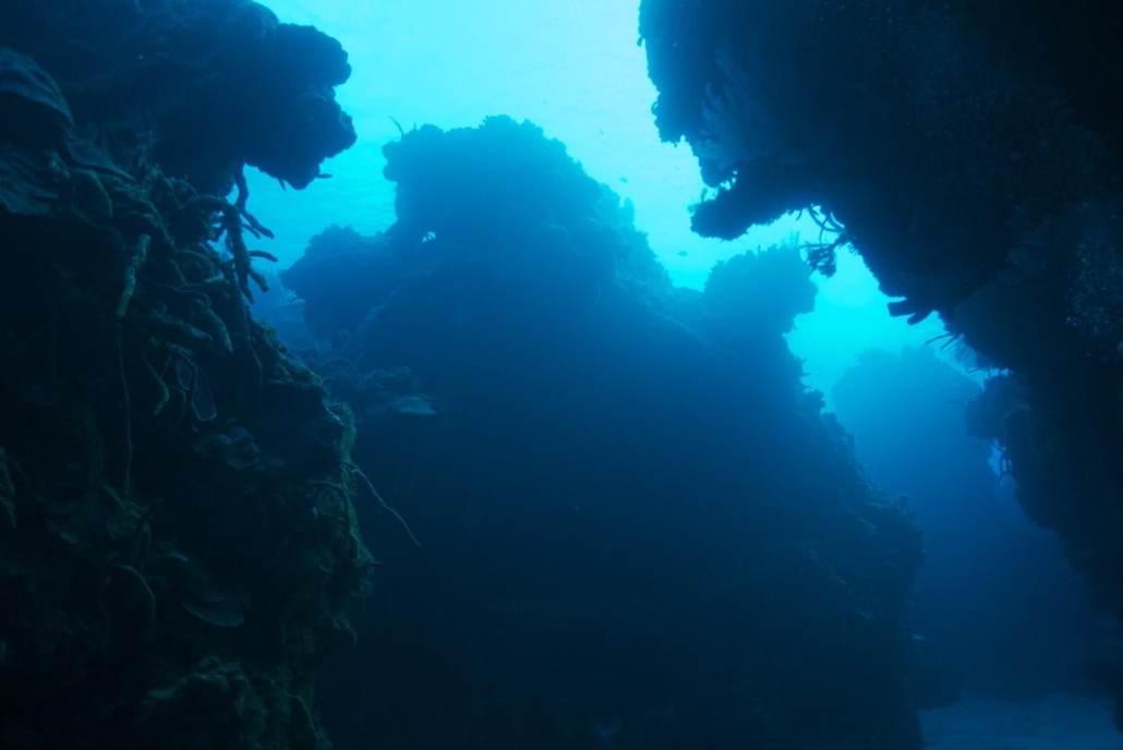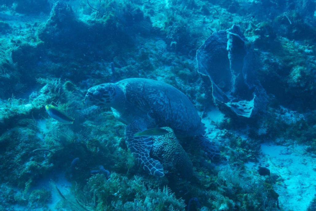 Wie gesagt, hierher kommt man zum Tauchen, denn die Bedingungen dafür sind ideal. Es geht für mich tatsächlich zum Palancar Reef und ich erfahre, dass dieses Riff aus mehreren Tauchplätzen besteht. Für mich geht es diesmal zu den Palancar Caves, DEM Top-Tauchplatz. Das Briefing ist ausführlich, denn die Strömung scheint hier ein wichtiges Thema zu sein. Wir sind zu siebt in der Gruppe, was mich zum Buddy des Tauchguides macht. Rein ins Wasser! Schon beim Abtauchen erkennt man die Struktur des Palancar Reefs, die vorher im Briefing besprochen wurde. Tiefe Canyons, bohren sich wie Schluchten in das Riff, welches auf der einen Seite tiefblau abfällt. Eine Steilwand mit bewachsener Pracht. Die ersten Schildkröten ziehen vorbei, gefolgt von Barrakudas und Rochen. Der Tauchgang hat noch gar nicht richtig begonnen, da sortiert er sich schon qualitativ weit oben in meiner Hitliste ein. Wir gehen tiefer in das Riff hinein, in dem wir einem Canyon folgen. Die schroffen Wände ragen links und rechts nach oben und durch den beträchtlichen Bewuchs sieht es teilweise aus, als ob die Wände überhängen würden. Wir kommen an die Kante und der Untergrund fällt weg. Sofort packt mich die Strömung und ich drifte am Riff entlang. Viele dichte und riesige Korallen haben die Riffblöcke bewuchert. Unser Tauchguide zeigt an, dass wir wieder ins Riff hineintauchen und wir biegen quasi in einen weiteren Canyon ein. Ich möchte am liebsten die ganze Zeit fotografieren, um diese einmalige Szenerie einzufangen. Die Schluchten sehen aus wie Irrwege in einem Labyrinth, mit dem Unterschied, dass man hier nur mal eben aufsteigen müsste, um den Weg nach draußen zu finden. Eine massige Gruppe Grunzer schlängelt sich unter einem Vorsprung entlang und lässt sich schaukeln. Ich mag diese Art von Fischsuppe, die wie eine Wand im Wasser steht und mache Foto um Foto. Als ich aufblicke erkenne ich, dass die Gruppe auf mich wartet. Sorry guys! Wir lassen uns über die Kante treiben und betrachten das Treiben im und am Riff. Plötzlich taucht unter mir eine kapitale Schildkröte auf, die die anderen wohl übersehen haben. Sie sitzt im Riff und knackt sich ihr Fressen ab. Ich kann die Geräusche hören, so intensiv malmt sie. Meine Anwesenheit scheint sie nicht zu stören, obwohl ich mich sogar vor ihr leicht im Stein festhalten muss, um von der Strömung nicht davon getragen zu werden. Sie schaut mich an, senkt den Kopf wieder und frisst weiter. Meine Bilder habe ich im Kasten, als ich wieder erschrocken feststelle, dass der Tauchguide mir zuwinkt. Wir sind schon eine ¾ Stunde unterwegs und die ersten Buddyteams beginnen aufzusteigen. Ich habe noch Luft und Bilder übrig. Also geht es weiter. Noch ein Rochen, Lobster – zwei Stück auf einmal in einer Höhle – und Tarpune. Mittlerweile dauert der Tauchgang schon eine Stunde und wir waren nicht gerade flach unterwegs. Nur noch ich und eine Dame sind übrig geblieben, ihr Mann hängt schon an der Oberfläche. Ich muss ebenfalls aufsteigen, als aus dem Nichts heraus ein weißer, glatter und schneller Fisch auftaucht. Er kommt direkt auf mich zu, wobei ich mir nicht sicher bin, ob es Neugierde oder Angriffslust ist. Er umrundet mich in einem sehr engen Kreis, bis er schließlich gegen meinen Oktopus rumpelt. Keine Ahnung, was das für ein Viech ist, aber es ist lustig, obwohl ich nicht weiß, ob er nicht vielleicht doch böse ist. Ich blicke nach unten, auf der Suche nach einer beruhigenden Geste, aber der Tauchguide und die „Frau ohne Luftverbrauch“ tingeln immer noch über die Korallenlandschaft. Als ich auftauche lässt der lästige Kollege mich schließlich in Ruhe. Was war das? Wieder an Bord, diskutiert die restliche Gruppe auch gerade über diesen aufdringlichen Unterwassergenossen und ich erfahre, dass es sich um eine Remora handelt, also einen Pilotfisch, der sich normalerweise an Großfische hängt. Daher also das Interesse an meinem Tank! Als ich mein Equipment so langsam abgebaut, mich abgetrocknet habe und ein frisches Stück Ananas genieße, kommt der Tauchguide endlich an die Oberfläche und schüttelt resignierend den Kopf. Diese Meerjungfrau ist nicht zu schlagen, sie kommt unglaubliche zehn Minuten später mit 100 bar Restluft an Bord. „Ich laufe Marathon“ flötet sie erklärend. Unfassbar…