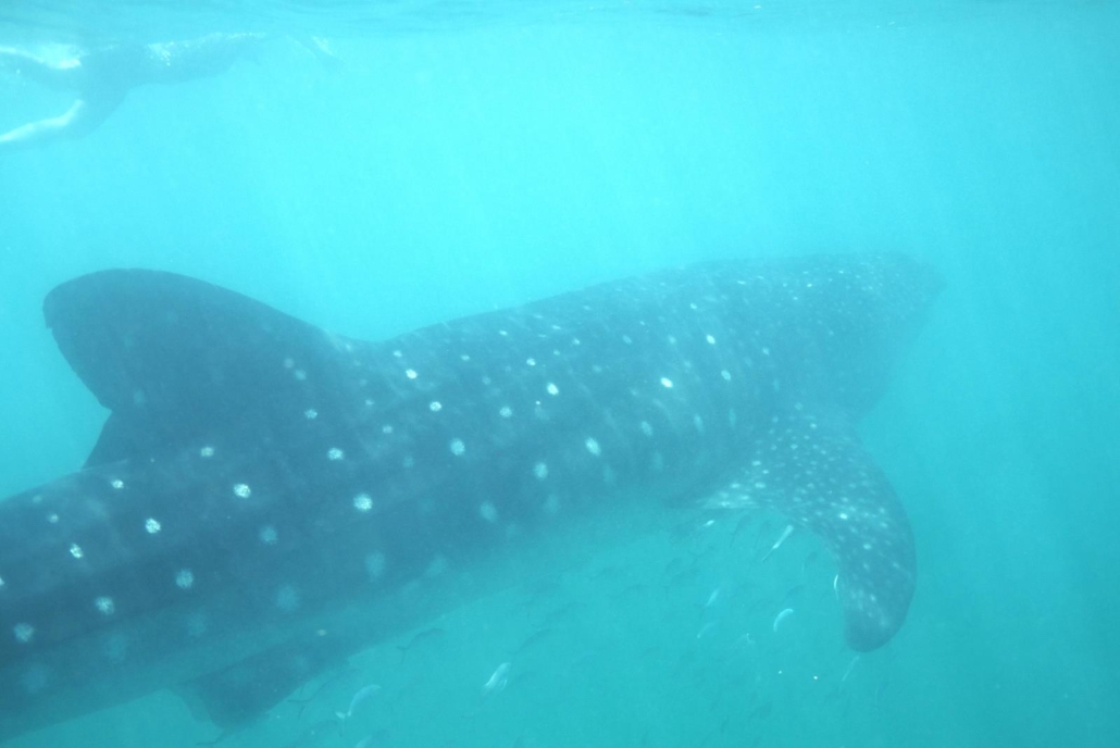 Unser Boot kachelt weiter über das Wasser und es dauert nur 5 Minuten bis wir die Geschwindigkeit wieder drosseln. Es haben sich schon drei weitere Boote an einem Ort versammelt, kein Wunder, das Wasser sieht aus wie ein angerichteter Futterteller, so viel Grünzeug schwimmt hier im Wasser herum. Wir orientieren uns kurz und als ich mich umsehe, sehe ich mehrere gepunktete Rücken mit Schwanzflosse. Die Aufregung steigt sofort proportional zum Wunsch ins Wasser zu springen. Dumm nur, dass jetzt Gruppe 3 dran ist und ich quasi bis zum Schluss warten muss. Auch die Gruppe 3 reagiert erst auf das Kommando Jump, nämlich genau dann als wir seitlich vor einem Walhai treiben. So kommt der Walhai auf einen zu und man kann ihn vorbeiziehen sehen oder eben versuchen mit zu schwimmen. Die Wartezeit kommt mir unendlich vor und ich habe wirklich Sorge, dass plötzlich alle Walhaie beschließen abzutauchen. Ich schaue mich um und versuche die Flossen zu zählen. Ich komme auf sage und schreibe fünfzehn Walhaie! Ist denn das die Möglichkeit?! Gruppe 3 kommt ekstatisch jubelnd zurück, genauso wie Gruppe 4. Ich kann quasi miterleben, wie sie die Walhaie perfekt beobachten und auch ein wenig „verfolgen“ können. Gruppe 5 besteht aus Hank und Mike. Das Boot neigt sich bedenklich in ihre Richtung, als sich die beiden Schwergewichte auf den Bootsrand setzen. Die beiden Texaner plumpsen ins Wasser und in der Kategorie „spektakuläres Eintauchen“ gibt es ganz sicher volle Punktzahl! Die beiden geben alles, um „ihrem“ Walhai zu folgen, aber die Power geht den beiden aus. Mike blickt zum Boot zurück auf und winkt resignierend mit der Hand. Sie paddeln zurück zum Boot und mit Krämpfen robben sie sich, unter der Mithilfe der Gruppe, wieder an Bord. Fast bäuchlings schliddert Hank auf die Sitzreihe. Er schaut auf und strahlt „das Beste was ich im Wasser je erlebt habe“. Cynthia lacht in die Runde, dass sie uns „ja vorgewarnt hat, dass obwohl die Walhaie so groß und träge wirken, sie verdammt schnell sind“. Gruppe 1 hat ebenfalls einen Volltreffer zu verzeichnen und erwischt es perfekt. Jetzt bin ich wieder an der Reihe und ich zittere richte vor Aufregung als ich auf mein Zeichen warte. Der Moment ist unglaublich spannend, wenn man dort auf einer Pobacke sitzt und diesen grauen LKW im Wasser in seine Richtung pflügen sieht. Dieses Mal lasse ich mir das Kommando nicht zweimal geben, sondern springe sofort los, orientiere mich kurz im Wasser, justiere die Kamera und erkenne auch schon das breite Maul des Walhais. 4 Liter pro Sekunde filtert so ein 1,5 m breites Maul und genau ein solches hält direkt auf mich zu. Der Walhai rammt mich fast und ich schaue voller Ehrfurcht immer zur Oberfläche, um meinerseits keinen anderen Schnorchler zu rammen, und dann wieder zum Walhai, um ihn nicht erwischen. Ich drücke gerade noch die Aufnahme-Taste meiner Videokamera, um direkt danach los zu kraulen. Der Walhai ist schnell, Wahnsinn wie schnell, ich finde Cynthia hätte uns darauf vorbereiten können, dass so ein Walhai schnell ist. Ich muss wirklich voll reinhauen, um diesem gepunkteten Güterzug zu folgen. Diese Nähe zu den Tieren ist faszinierend, ich kann die einzelnen weißen Punkte auf seinem Rücken genau erkennen und mir wunderbar anschauen. Die Punkte übrigens sind wie Fingerabdrücke, daran kann man einen Walhaie zweifelsfrei identifizieren. Ich kraule was das Zeug hält, um meinem Freund, dem Express-Zug, zu folgen, aber er zieht locker an mir vorbei. Ich komme mir unendlich klein vor, als seine schwingende Schwanzflosse mir klar macht, dass ich keine Chance habe ihm länger zu folgen.