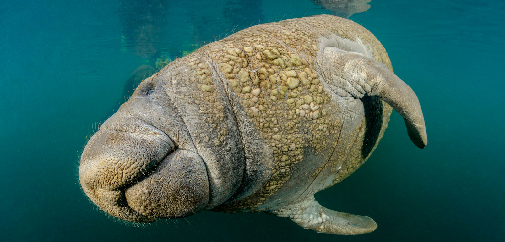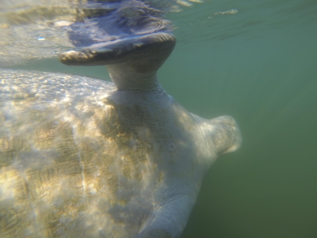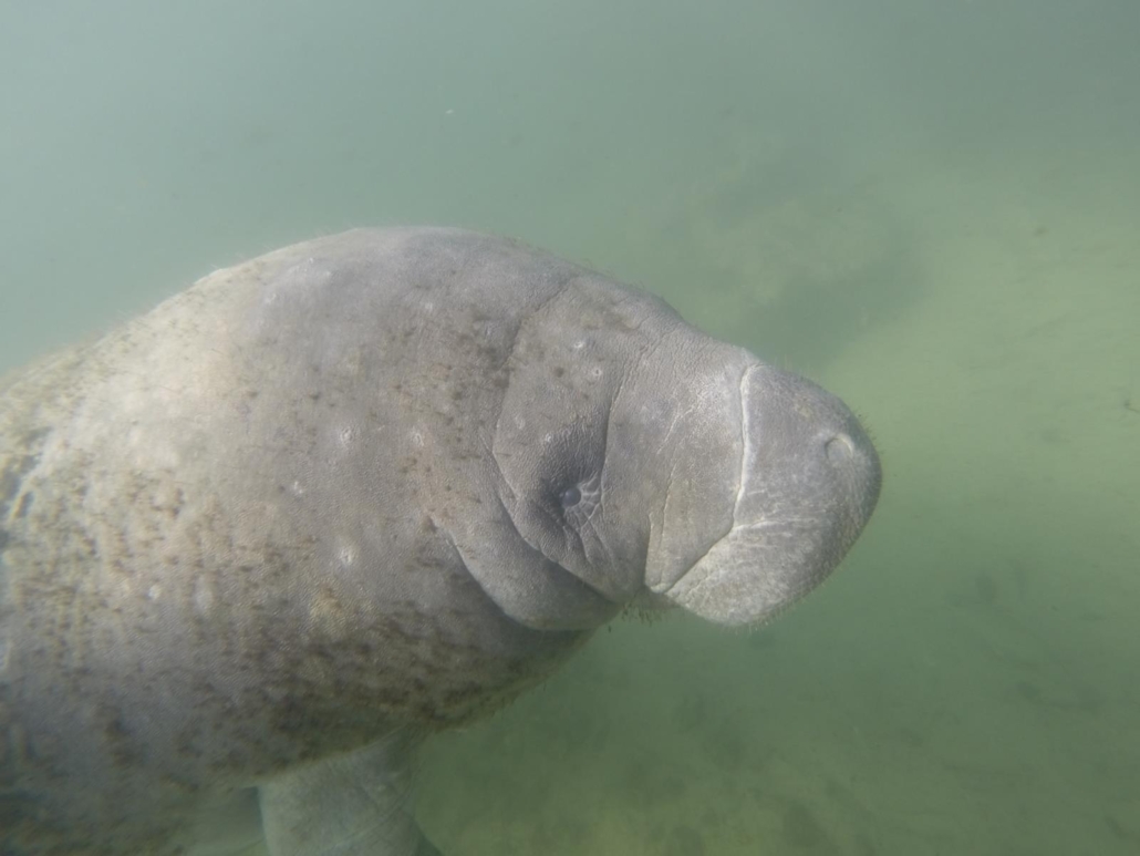 Die Sicht ist schlecht, ich schätze mal einen Meter, was das ganze Unterfangen zum einen schwieriger und zum anderen spannender macht. Man schaut in den blau-grau-grünen Wassernebel und jede Sekunde könnte ein 4,5 Meter-Tier auf einen zu schwimmen. Aufregend! Ich schwimme und schaue, drehe mich und fange doch an ein wenig zu planschen. Mist. Ruhig bleiben und entspannt im Wasser liegen – das war die Devise. Ich schaue kurz aus dem Wasser, um vielleicht eine an die Oberfläche kommende, schnaufende Schnauze zu sehen, aber da ist nichts. Also wieder unter Wasser, dichtes Grün und kein Manatee. Meine Wasserlage beruhigt sich etwas und ich bilde mir ein, meine Umgebung wird etwas dunkler. Kommt da etwas auf mich zu? Tatsächlich, plötzlich taucht eines von diesen herzigen Gesichtern vor mir auf, aber viel langsamer, als ich es vermutet hatte. Ich hatte tatsächlich befürchtet, dass ich vielleicht einfach weggepflügt werde, wie Schnee von einem Räumfahrzeug, aber dem ist nicht so. Das Manatee nähert sich ganz langsam, ja, es schaut mich erst mal genau an und wird noch langsamer, bis wir fast nur nebeneinander hertreiben. Unglaublich wie niedlich es ist und mich mit den Knopfaugen inspiziert. Dann wird es wieder etwas schneller, um gleich wieder langsamer zu werden. Und dann sehe ich auch den Grund, zwei weitere Manatees gesellen sich zu uns. Wir bleiben nur kurz zu viert, die anderen beiden ziehen nach einer kurzen Begegnung weiter, so als ob „mein“ Manatee mich den anderen nur kurz vorstellen wollte. Und dann passiert es, die Kuschelkuh dreht sich auf den Rücken und streckt mir ihren massigen Bauch entgegen. Natürlich bin ich gehemmt, schließlich soll ich die Manatees ja nicht berühren. Es rollt sich wieder zurück und stupst mich dabei seitlich an. Gleich darauf kommt nochmal die Streichelaufforderung und dieses Mal gebe ich nach. Fühlt sich lustig an und mein Spielkamerad lässt sich diese Einheit lange gefallen. Eine Stunde vergeht wie im Nichts!