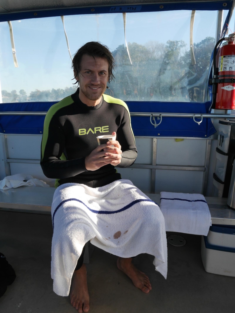 Klasse, es kann los gehen! Leider erwische ein Temperaturtief, denn das Wetter ist schön, aber es ist frisch, um nicht zu sagen kalt. Sich da um 7 Uhr morgens in den Neoprenanzug zu winden, um gleich ins Wasser zu gleiten, ist erst mal keine Wunschvorstellung. Aber die vorfreudige Aufregung schiebt jeden kritischen Gedanken beiseite.