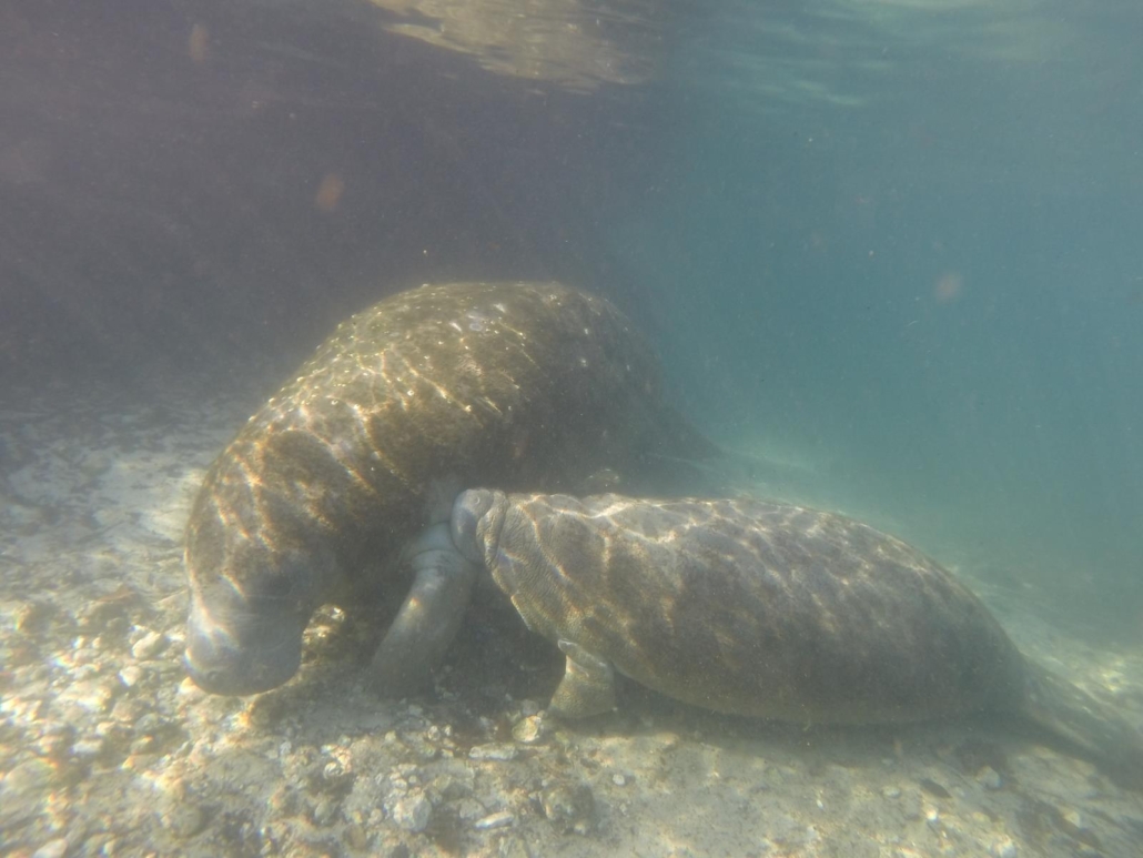 Als die zweite Runde beginnt, ist es unter Wasser gleich komplett anders, vor allem weil die Sicht so gut ist. Hier sehen wir Manatees kommen, wie sie uns passieren oder aber irgendwie anders beschäftigt sind. Wir schwimmen durch eine Art Bachlauf in ein ruhigeres Gewässer und ich erkenne jetzt, dass dies hier das eigentliche Schlafzimmer ist. Ich bewege mich ganz ruhig, um ja kein schlafendes Manatee zu wecken. Sie liegen ganz ruhig am Grund, teils alleine, teils zusammengekuschelt, Kinder bei ihren Mamis und manche scheinen sogar im Wasser zu schweben. Unglaublich diesen großen Tieren so nahe zu kommen und sie in Ruhe beobachten zu können.
