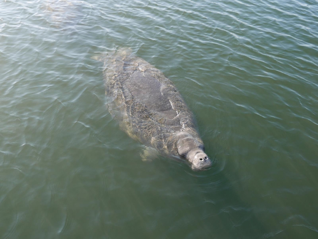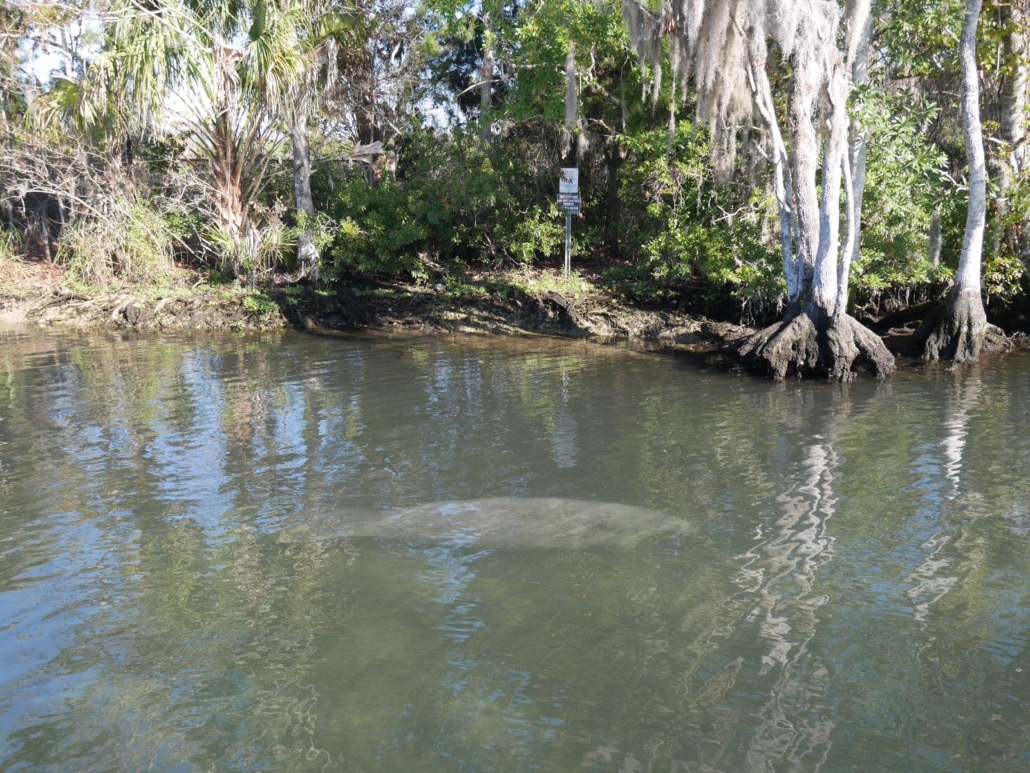 Die Fahrt führt uns in einen tieferen Zweigbereich des Crystal River und das Wasser wird deutlich klarer. Wir können vom Boot aus schon richtig viele Manatees beobachten, wie sie entweder auf dem Weg ins Schlafzimmer sind oder aber sich in Richtung Disko aufmachen. Erstaunlich zackig sind sie dabei teilweise unterwegs und der Kapitän erklärt mir, dass Manatees bis zu 25 km/h schnell werden können! Das hätte ich diesen behäbig wirkenden Wesen nicht wirklich zugetraut. 500 kg verteilt auf 4 Meter mit einer solchen Geschwindigkeit? Nicht schlecht.