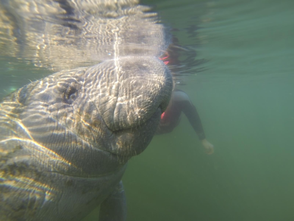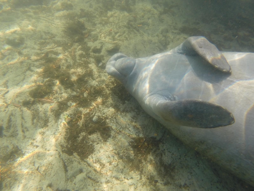 Wir drehen eine Runde und schauen einer Mutter zu, wie sie sich mit den vorderen Flossen um ihr Kleines kümmert. Sensationell und herzerwärmend. Auf dem Rückweg stoßen wir auf eine Gruppe „schlafloser“ Manatees, die scheinbar richtig lustig drauf sind. Sie umkreisen uns und rumpeln förmlich in uns hinein. Ich kann gar nicht ausweichen, so oft dotze ich links und rechts gegen einen massiven Bauch. Aber genau das scheint ihnen zu gefallen, ein Manatee stupst mich wie ein Hund mit der Nase an, man könnte fast meinen, es küsst mich. Ich muss in meinen Schnorchel hineinlachen, weil die Situation so unfassbar skurril ist. Umgeben von Manatees, die sich hastig um die besten Plätze, um mit uns spielen zu können, rangeln. Plötzlich fällt mir das Video ein, dass mir am Anfang gezeigt wurde und ich muss feststellen, dass die Manatees dieses Video offensichtlich nie gesehen haben! Sie berühren mich, sie bewegen sich schnell, sie erschrecken mich, sie schneiden mir den Weg ab… Eine Strafe sollte ihnen sicher sein!