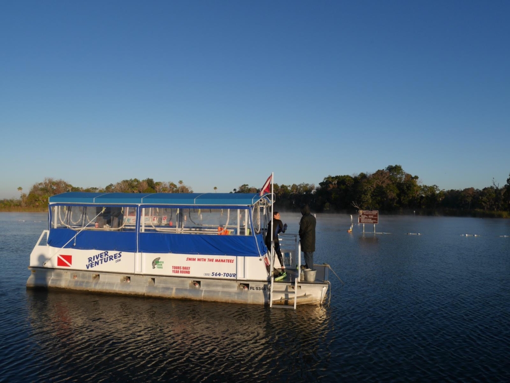 Als ich am nächsten Morgen beim Frühstück sitze und mir klassisch amerikanisch einen French Toast mit Bacon genehmige, geht gerade die Sonne auf und der Himmel wird hellblau. Super Bedingungen, außer, dass die Außentemperaturen noch etwas frisch sind. An der Tauchbasis angekommen, begrüßt mich der Kapitän, ein bärtiger Seebär, der ideal zur anstehenden Tour passt. Er legt mir ein Video ein, welches mich auf die kommenden Stunden vorbereitet, denn es wird erklärt, was man darf und was man tunlichst vermeiden sollte. Natürlich darf man die Tiere nicht berühren, sie nicht erschrecken, sie nicht einkreisen, ihnen nicht den Weg abschneiden oder sich zu schnell bewegen. Manatees sehen sehr schlecht, dafür haben sie aber feine Haare am ganzen Körper, die wie Detektoren funktionieren und sie über jede Aktion in ihrem Umfeld in Kenntnis setzen. Der Schutz der Manatees wird im Crystal River großgeschrieben, dieses Gebiet soll kein Zoo sein, sondern die Tiere sollen weitestgehend ungestört leben können. Es gibt sogar Überwachungskameras unter Wasser und man bekommt eine Strafe, wenn man zum Beispiel ein schlafendes Manatees weckt oder erschreckt – eine gute Sache wie ich finde. Dennoch bin ich gespannt wie die Begegnung mit den Manatees bei so vielen „Don`ts“ ablaufen wird. Als ich das Video fertig angesehen habe, lacht mich der Seebär an und meint, dass das im Video nur Theorie ist. Die Manatees seien, so sagt er, lustige, fast schon abenteuerlustige Gesellen und suchen sogar den Kontakt. Hä? Und das Video? Er scheint wohl meine Gedanken zu lesen oder aber mein Gesichtsausdruck ist entsprechend seltsam, weshalb er nachlegt und mir erklärt, dass die Manatees sich quasi ihre Spielfreunde heraussuchen, sprich sie lassen es mich spüren, ob sie Spaß daran haben mit mir zu planschen oder aber ob sie mich eher wie beim Wählen des Eishockeyteams in der Jugend früher als letzten auswählen würden, weil ich überhaupt nicht Schlittschuhlaufen kann. In dem Fall schwimmen sie schneller oder aber tauchen einfach ab. Wenn mich ein Manatee allerdings ganz besonders klasse findet, dann dreht es sich sogar auf den Rücken und will am Bauch gestreichelt werden. Das ist doch mal ein Ziel, so einen Spielkameraden versuche ich heute im Crystal River zu finden.
