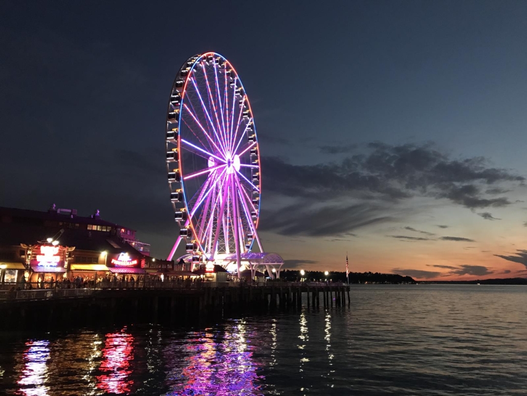 Unterwegs kommt ihr unter anderem am Pier 57 mit dem Seattle Great Wheel vorbei, von wo aus ihr eine gute Aussicht über das Wasser habt. Ich fand die Atmosphäre dort ganz wunderbar – an einem Sommerabend zum Sonnenuntergang hier die Aussicht zu genießen ist wirklich ein herrliches Erlebnis.